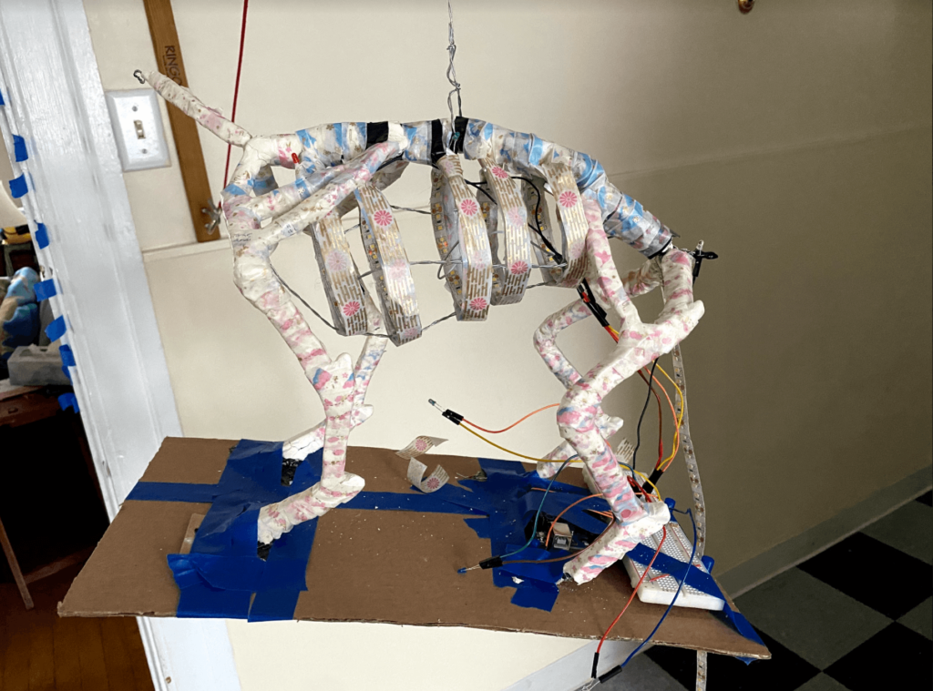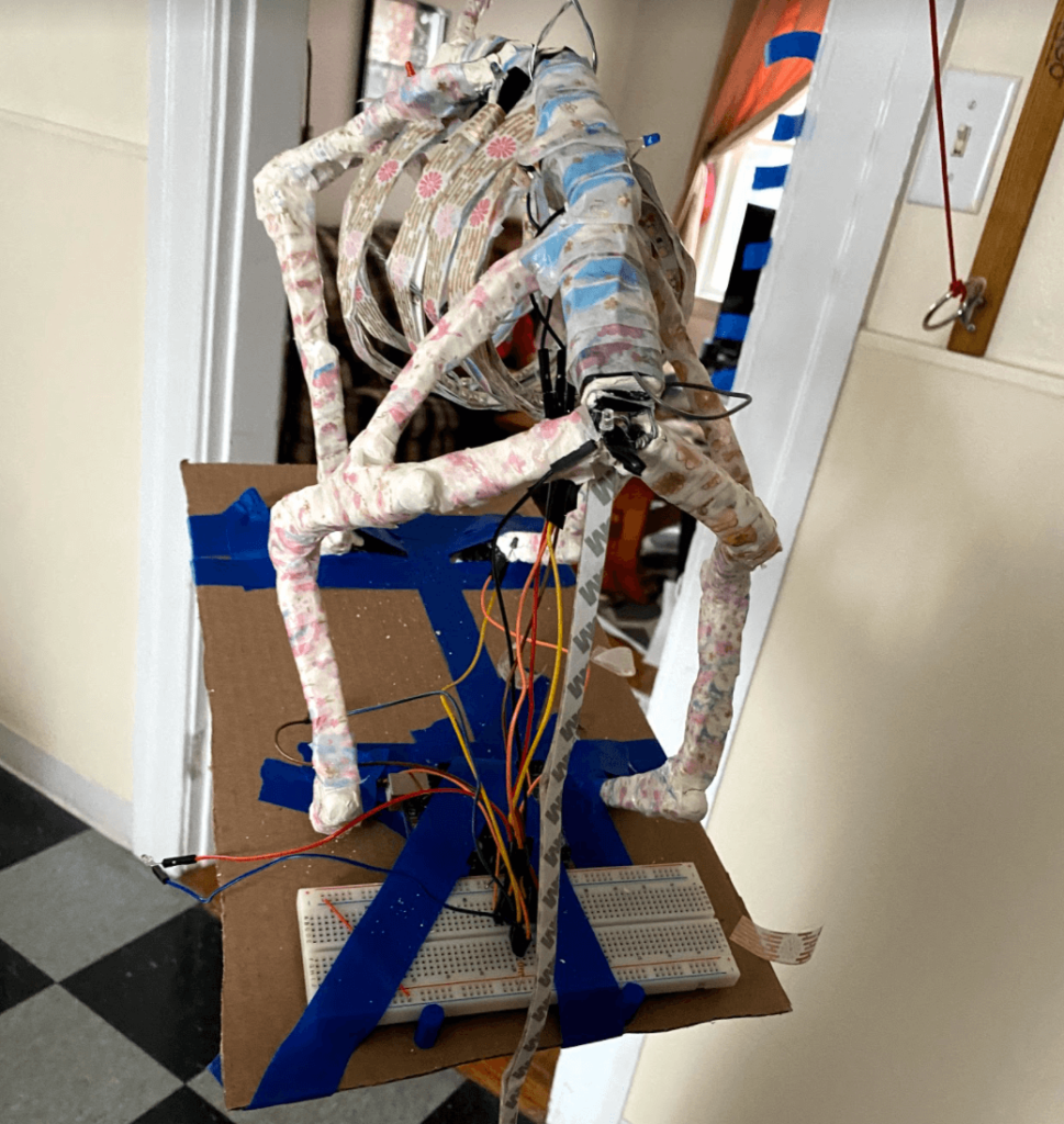 Admittedly, these next two photos were accomplished some days after this assignment was due, but I feel like they embody when I actually accomplished “all working”. The skeleton is completely bound and wired up, with LEDs up the spine for the crystals, and the LED tape snugly inside the ribcage.