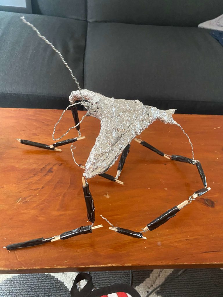 I began constructing a much larger skeleton frame out of the doubled-up wire. I wish I had taken a picture of the dog made purely of wire, but unfortunately, I did not. However, the all wire dog was still far too flimsy to stand or even sit. Frustrated, I turned to the other materials I had on hand: wooden picks, duct tape, and aluminum foil.