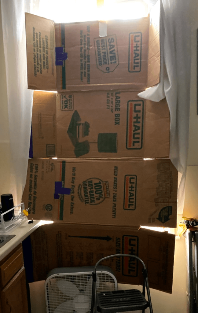 I was running late getting everything ready for the in class presentation. I wanted the room to be dark so that the lights would really pop, so I covered up the windows with cardboard.