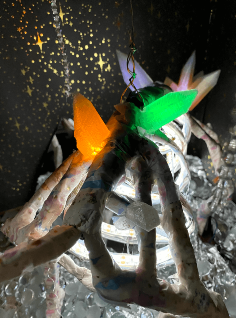 The crystals are so impressive, especially because they were 3D printed. I love how you incorporated the background to help make the light have a greater effect.