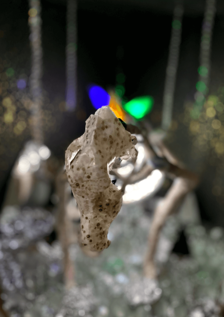 Finally, class came, and unfortunately the LEDs decided to be finicky. The yellow and red crystals flickered and went out for large amounts of time. Regardless, I still got a few good pictures. I had decided to house the dog in a cardboard box, in which I had lined the walls with sparkly paper. I decorated the floor with foil and glass, and put mirror-shard stalactites around the environment. From the ceiling, I draped glass beads.