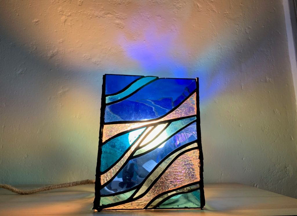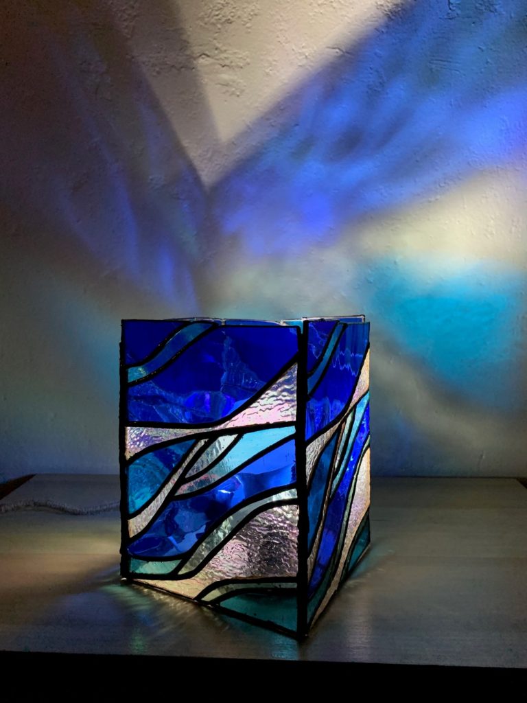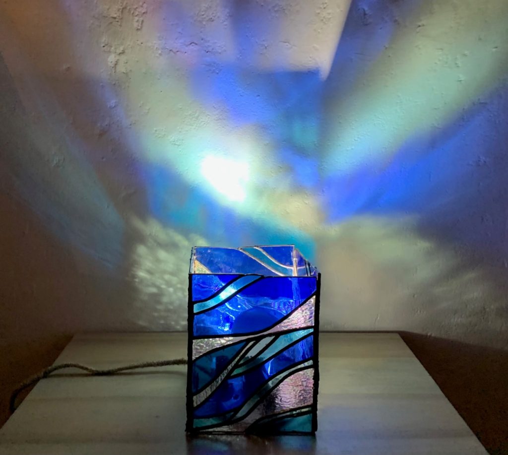I like this project because I feel like I get to experience your art in two different ways. First is the direct stained glass, which is so soothing and water-like, and looks professionally put together. Secondly is the reflection on the wall, where I can see how the light is scattered by the glass in wave patterns. I really like how you contrast the curvy wave patterns of the glass with the square, rectangle body of the lamp. Really well thought out project, and something I would love to learn or watch in person someday.
