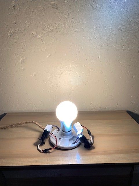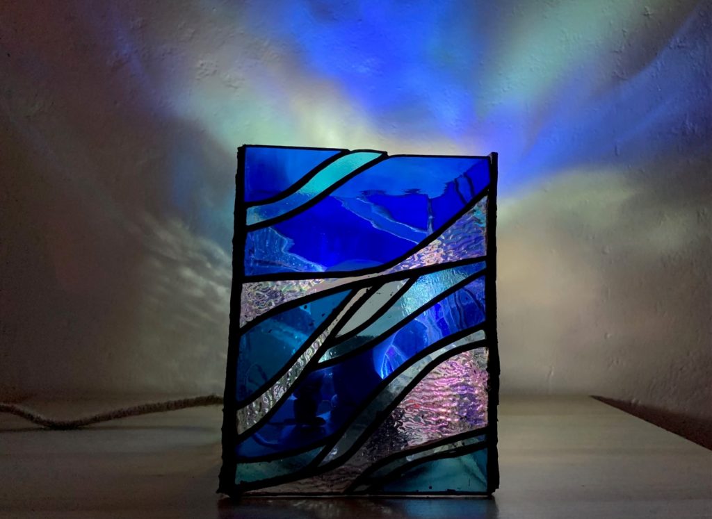 I ended up finishing my whole project this week! I grinded all of the glass pieces, soldered the sheets, and soldered each sheet together in the rectangular orientation of the lamp. The solder is silver, but I have a solution that you put on it that turns it black which I think looks a lot better then the silver. I also got two small LED spotlights that I wired to the light socket that I bought. The spotlights were the perfect touch, it illuminated the lamp just as I imagined in my head and they created really great shadows and color patterns. For my final documentation I found an empty wall in my room and placed my lamp on top of a wooden table that I have. I am not trying to conceal the lamp wire since it is an artistic piece to my project being wrapped in twine.