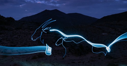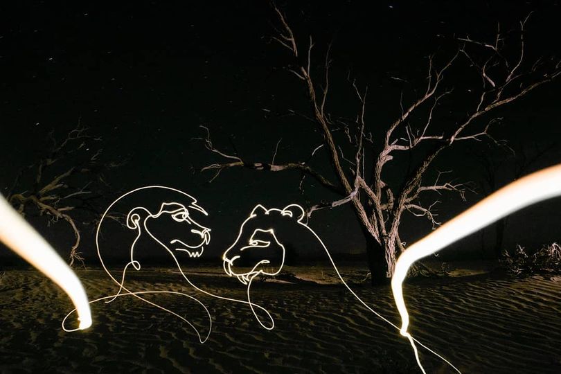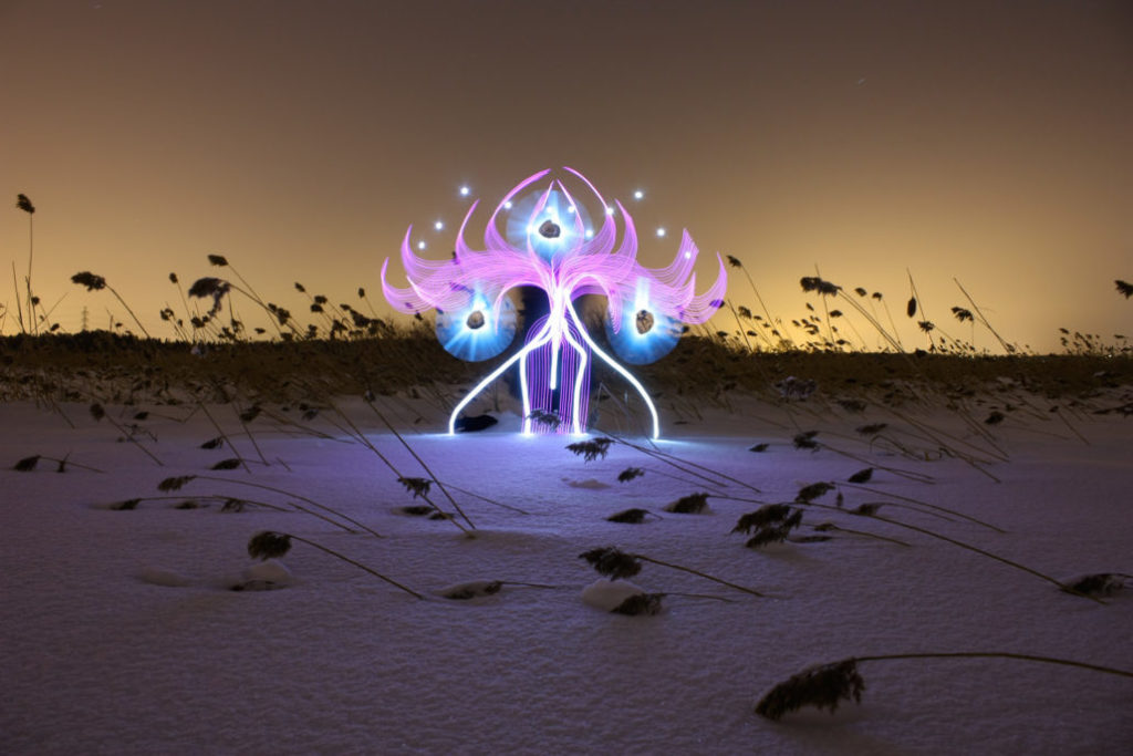 He has several light flowers and luminous beings that he says represents hope and order in the middle of chaos. He uses his art as a form of meditation, hoping to find balance and symmetry in his life. He also went on a trip to Namibia for a collaboration and got inspired by his surroundings, creating animals and growing his light flowers in a whole new environment. Huhtamo also creates light portraits using the same techniques and tools he does for his other works.