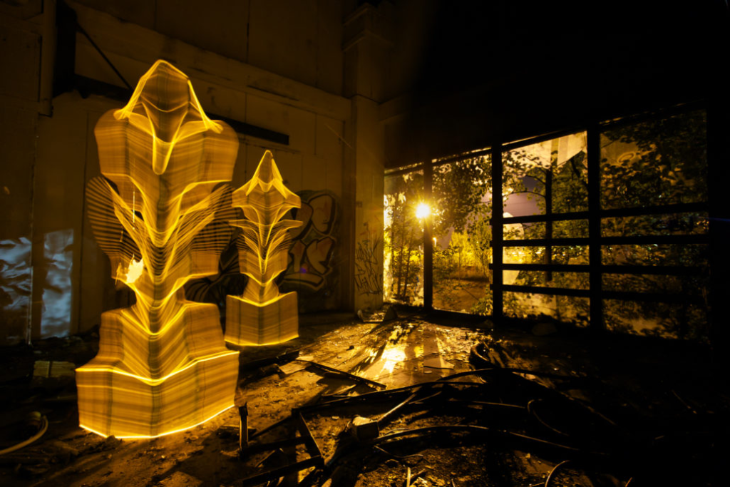 Hannu Huhtamo is a well known light artist who uses long exposure photography to create his pieces. This technique called, “light painting” or “light drawing” allows him to use darkness as his canvas and light as his brush. Huhtamo lives in Helsinki, Finland and originally pursued a career in music. However, in 2008 he began working on light art and became a master of this craft. He is inspired by everything around him, including nature, unique forms, dreams, and other artists. Most of his work focuses on floral shapes and organic figures, as he is fascinated by the symmetry in nature. Many of his “canvases” are in abandoned houses and dark woods. He is continuously trying to understand and examine the definition of beauty through the environment, aiming to find hidden beauty in unusual and forgotten places.