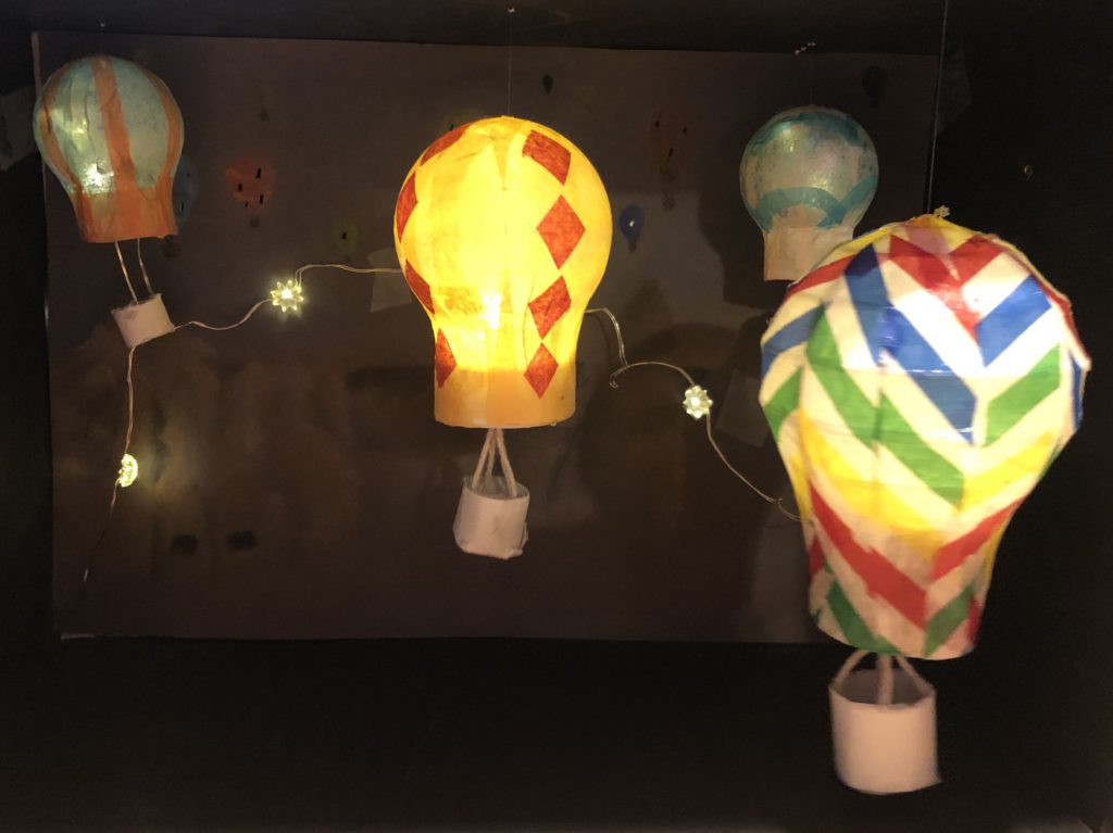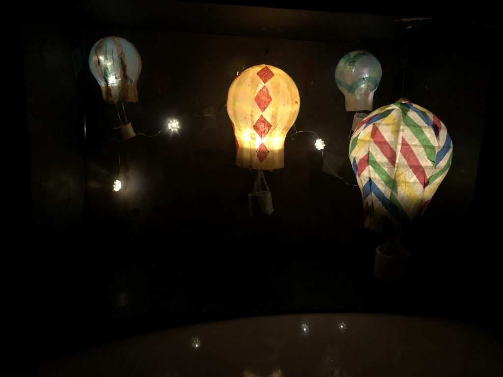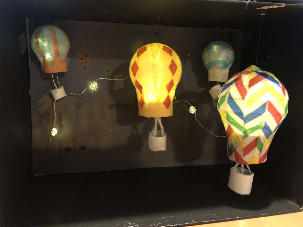 This week I was able to finish stringing my balloons to the box and my background drawing. I used fishing line to attach the balloons at different heights and added the background to a piece of cardboard offset from the back of the box using glue. I am pretty much all set with everything for my project! I am just finishing up getting the lighting right for high quality pictures of the final piece. I will also take a video so the flickering of the lights could be experienced. I was able to incorporate the string lights as both stars and the lights for the balloons in the drawing.