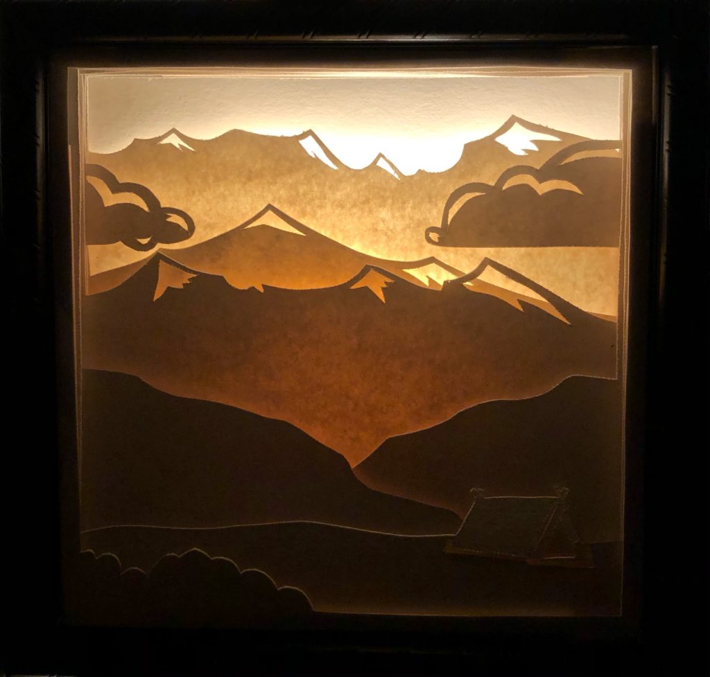For my final project, I created an 8″ square hand cut-paper light-box that consists of layers of paper each cut to portray a different aspect of the final image. In order to present this piece, I put the box in an extremely dark environment and shone an industrial-style light directly behind it. This is the result: