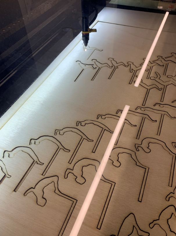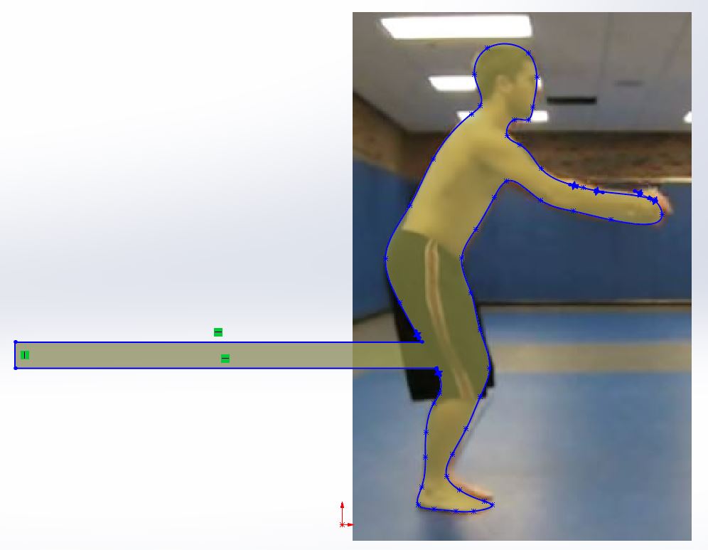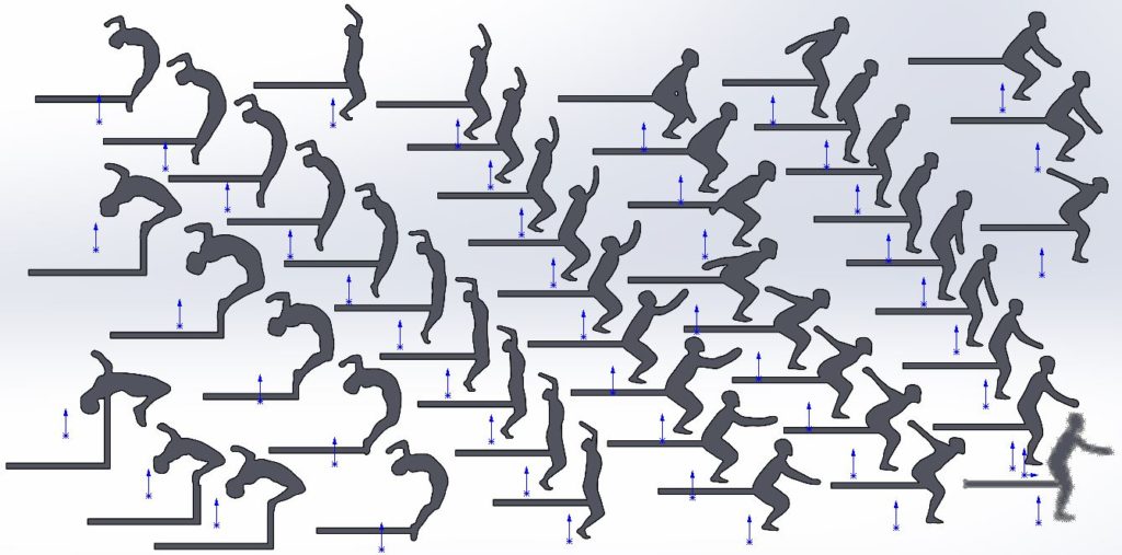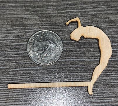 The frames were the most time consuming portion of the project. Slowly, each frame of a real video of a back flip was screenshot. The screenshots were uploaded into SolidWorks and traced with a spline. Then the connector was added. After doing this for 60+ frames, each one was added to an assembly in order to make a drawing to send to the laser cutter. The most difficult part of the frame design process was maintaining proportions and fluidity between frames.