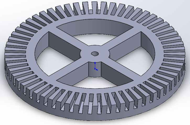 The hub began as an easy design. It was just a wheel with 60 slots all around it which would fit the frames. The slots were perfectly vertical, and the frame connectors would be tilted so that the above light source would land on the face of the frame. This would make it incredibly difficult to manufacture the frames. It was suggested that I instead angle the slots and laser cut the frames and connectors. The motor was chosen to spin at 60rpm so that the animation would last about one second, and the mount was designed around the motor, and would be wired with a battery and a switch.