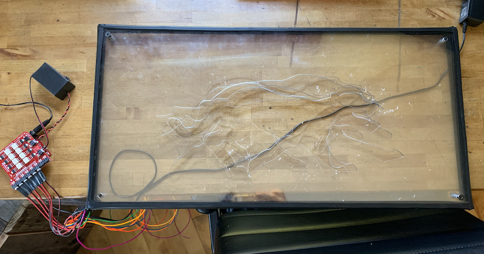 surprisingly I made a major redesign durning the last week. after realizing it would be very difficult to attach the wire long the outline of the dogs I decided to make use of the optical effects of acrylic and attach the wire to the outer edge of each sheet instead. This has its pros and cons as it makes the piece look much cleaner but at the cost of being less bright. With any natural daylight the animation becomes invisible but at night it looks great. my plan its to mount the piece with a wood frame to cover the edged of the acrylic where the wire is taped down. I also want to file the edges the dogs a bit to make the acrylic refract more light towards the viewer.